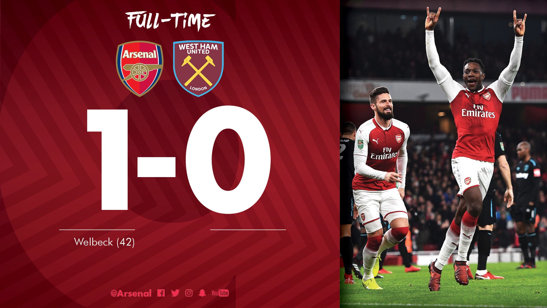 Jaringan tunggal Danny Welbeck pada minit ke-42, bawa Arsenal ke Separuh Akhir Piala Carabao 2017.