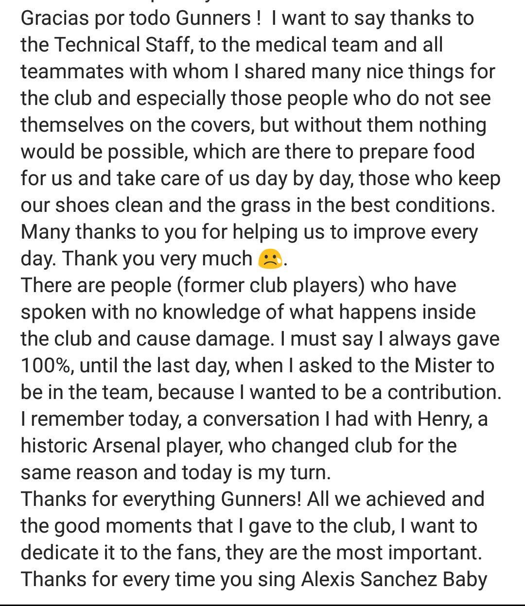 Seolah Sanchez bertindak 'membalas dendam' dengan apabila didalam ucapan perpisahan beliau itu, beliau turut mengaitkan (tanpa menyebut nama mana-mana individu) bekas pemain Arsenal yang kerap mengkritik beliau ketika bersama Arsenal.