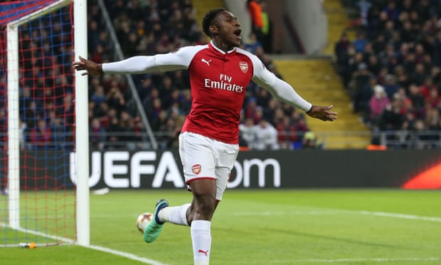 | Danny Welbeck of Arsenal celebrates scoring his sides first goal, to make it 2-1. Photograph: Steven Paston/BPI/REX/Shutterstock via The Guardian. |